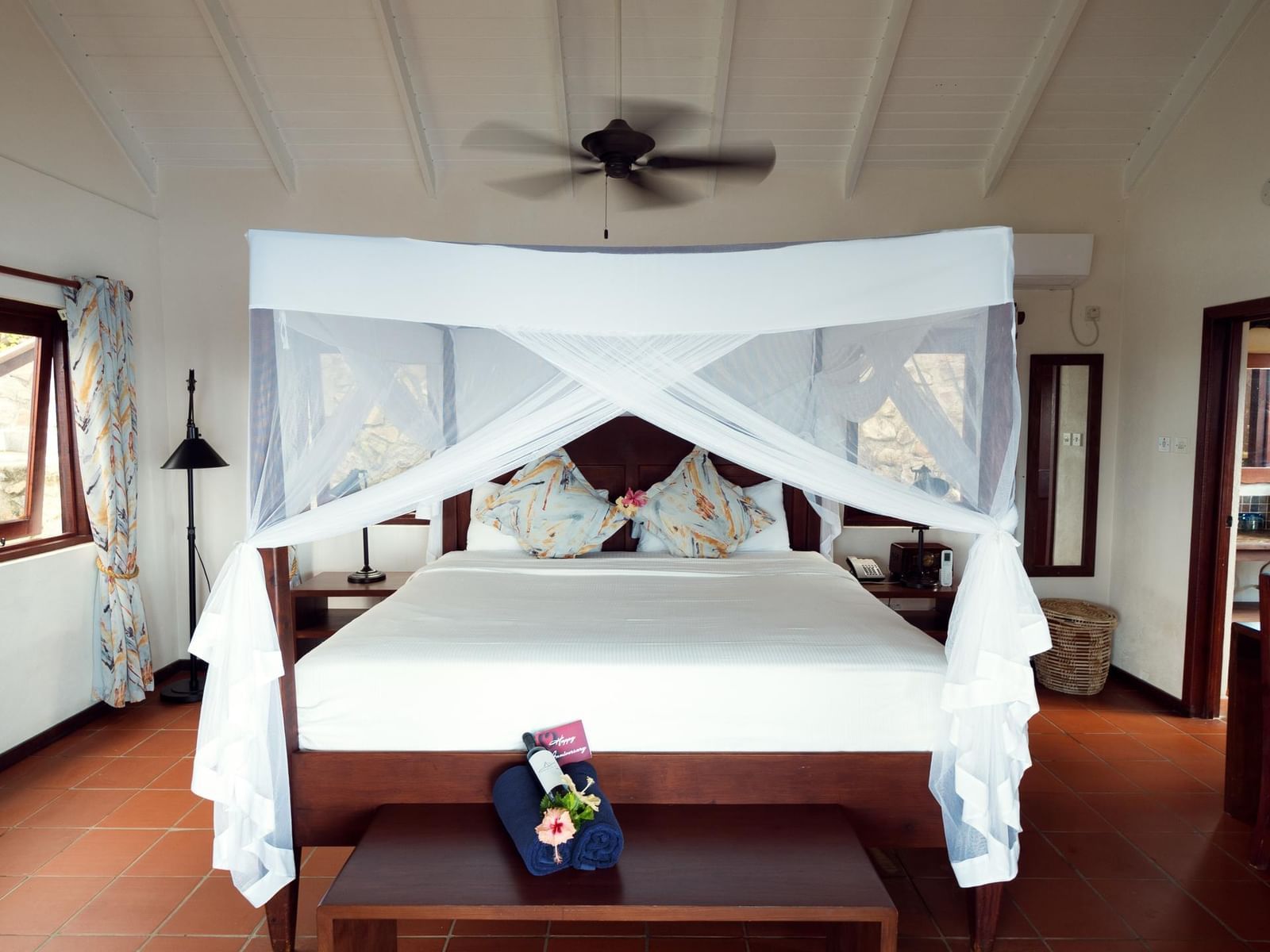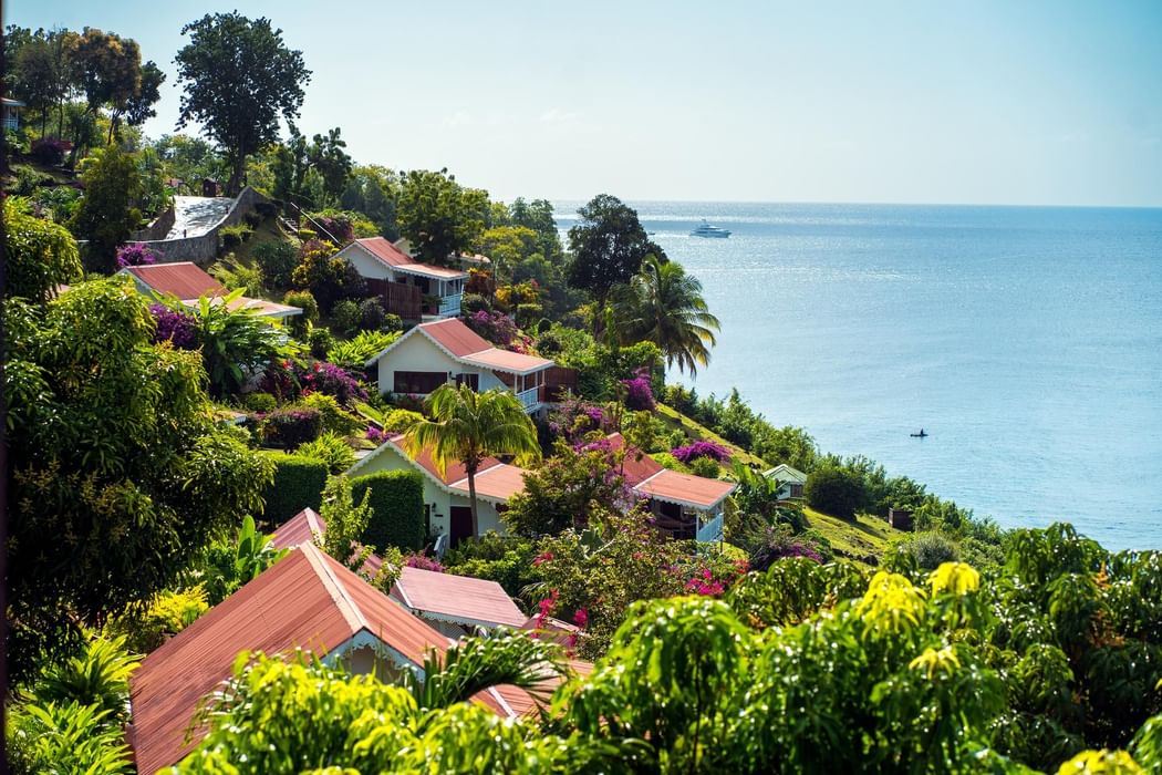 A peaceful Caribbean retreat featuring a king bed and private veranda with beautiful views of the ocean and surrounding tropical gardens.