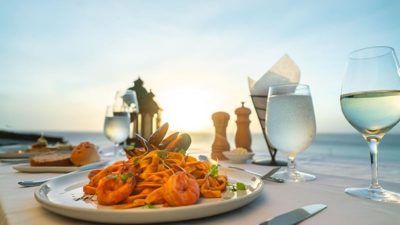 Indulge in a unique dining experience at Kai Manje Restaurant, where the stunning turquoise bay captivates during the day, and the breathtaking sunset views enchant at night.